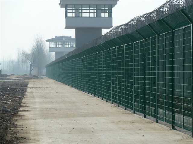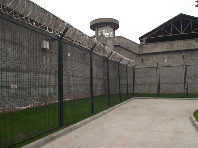 监狱隔离监狱钢网墙防护网网片主要采用不同规格的的金属铁丝经焊接(编织)加工成网状,主要丝径有4mm,4.8mm,5mm,6mm。监狱隔离防护网网片加工的网孔规格有:50X50mm,70X150mm,80x160mm等等。监狱隔离防护网网片两侧的防护立柱采用国标尺寸:圆柱:直径48mmX2mm圆管,直径60X3mm圆管,直径80mmX5mm圆管等等:方管有40X40mmX2.5mm,48X48X3mm,60X60X3mm等等。监狱隔离防护网网片整体尺寸规格:2mX3m,1.8mx2.7m等等。监狱隔离防护网网片表面处理方式可选择:电镀锌处理(银白色),热镀锌处理(银白色),喷塑、浸塑处理(白色,草绿色,墨绿色,黑色,蓝色,黄颜色,红色等等),镀锌后浸塑处理等等,根据防腐性能的要求不同,进行不同的处理方式。监狱隔离防护网网片还可根据客户要求,地形图纸,设计不同规格尺寸围网。